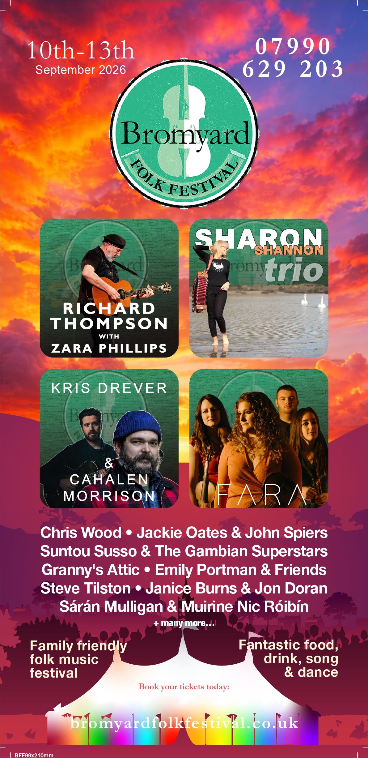 | Event Description: | Bromyard Folk Festival returns to the heart of the Welsh Borders for another exceptional weekend of music, culture and community. Across three packed days, audiences can experience almost 100 events taking place in 20 welcoming indoor venues, featuring around 400 performers from across the UK and beyond. From headline concerts and intimate acoustic sessions to lively ceilidhs, dance displays and participatory workshops, the festival offers an immersive celebration of traditional and contemporary folk. This year’s programme features an outstanding line-up including Richard Thompson with Zara Phillips, Sharon Shannon Trio, Kris Drever & Cahalen Morrison, FARA, Chris Wood, Jackie Oates & John Spiers, Suntou Susso & The Gambian Superstars, Granny’s Attic, Emily Portman & Friends, Steve Tilston, Janice Burns & Jon Doran, Sárán Mulligan & Muirine Nic Róibín, Keith Donnelly, Lauren South, Culverake, Wet The Tea and Alex Akiba.. Together they represent the breadth of today’s folk tradition, from internationally respected pioneers to emerging voices shaping the future of the genre. With lots of the venues indoors and within easy reach of one another, festival-goers can move effortlessly between concerts, club stages and dance floors, enjoying music in comfort regardless of the weather. Alongside the main concerts, there is a full programme of dance, spoken word, sessions, workshops and dedicated children’s activities, ensuring a vibrant and inclusive experience for all generations. Founded in 1968 to support and promote traditional folk music, song and dance, Bromyard Folk Festival remains true to its charitable purpose while continuing to present artists of the highest calibre. Audiences can expect a weekend defined by musical excellence, warm hospitality and the enduring spirit of tradition. Join us in Herefordshire and come and experience The Best of Folk! |